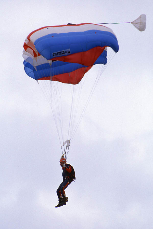Fallschirmspringer Die Fallschirmspringer werden regelmäßig zu den vermeintlich unattraktiven Zeiten am Vormittag eingeplant, obwohl sie ebenso regelmäßig großen Zuspruch seitens des Publikums erfahren. (ILA 1998) |